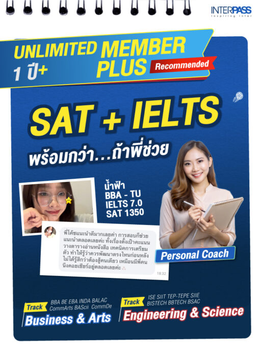 ดูรายละเอียดไม่ใช่แค่คอร์สเรียน แต่คือโค้ชคู่ใจตลอด 3 ปี โดย InterPass คือตัวเลือกที่พ่อแม่มั่นใจและน้องๆ พึ่งพาได้จริง ตั้งแต่วันแรกจนถึงวันสอบติด Unlimited Package คืออะไร? Unlimited สามารถเลือกเรียนได้ทั้งหมด 21 คอร์สสามารถยื่นได้ทุกคณะภาคอินเตอร์ พร้อมโค้ชดูแลตลอดอายุ ทำไมต้องเลือก 1 Year+ Member program เหมาะกับใคร? คนต้องการแผนชัดเจนในการสอบเข้า สนใจในกลุ่มคณะสาย Bussiness Engineering Arts เงื่อนไขการเรียน? ● เงื่อนไขการเปิดคอร์สเรียนSET C เปิดคอร์สเรียนครั้งแรกได้พร้อมกัน 3 คอร์สและจะสามารถเปิดคอร์สถัดไปได้ก็เมื่อ 1 ใน 2 คอร์สที่เปิดไป เรียนถึง 80% ● เงื่อนไขการส่งหนังสือSET Unlimited จะจัดส่งหนังสือ ฟรี ในครั้งแรกครั้งต่อไปจะมีค่าจัดส่ง 150 บาท/ครั้ง จัดส่งหนังสือได้มากสุดครั้งละ 4 คอร์ส